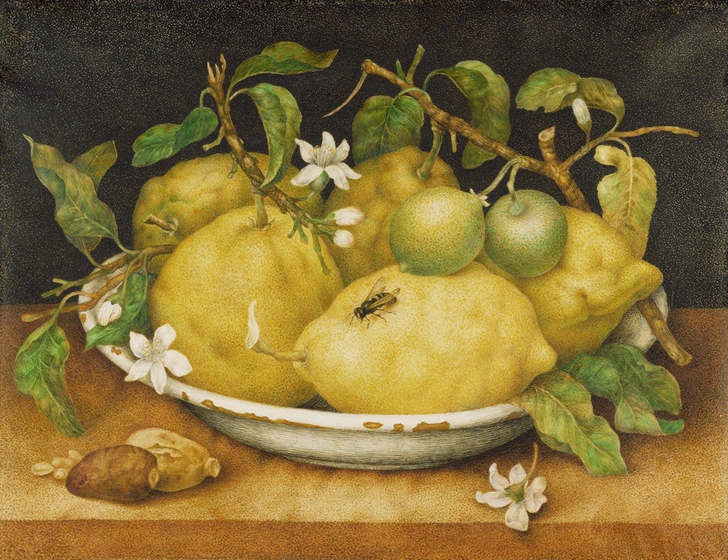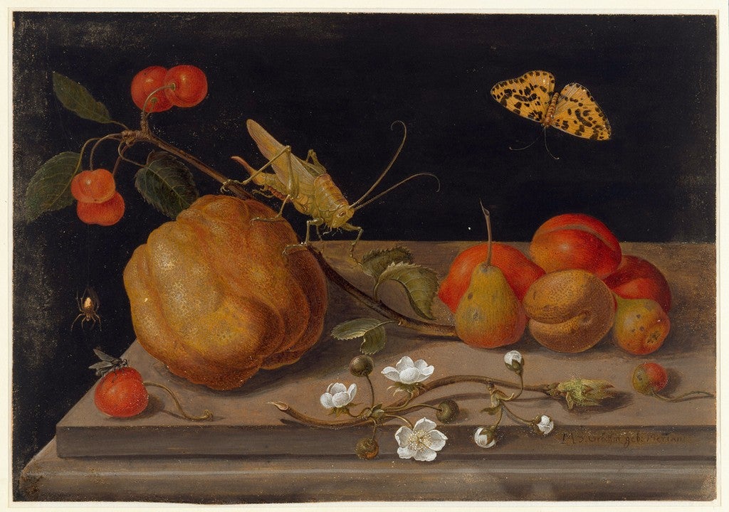 Scientific observation and precision governs the art of the next three practitioners: Giovanna Garzoni, Maria Sybilla Merian, and Rachel Ruysch. Born in the region of Le Marche, Garzoni (1600-1670) worked at the Medici court in Florence producing botanical and zoological renderings, most in tempera on vellum, like the diminutive Still Life with Citrons. Another rediscovery by Mary Garrard, Garzoni’s skill was honored by a retrospective at the Uffizi in 2020. Merian (1647-1717) was a Netherlands-based naturalist, entomologist and botanical illustrator who is best-known for her brilliantly crafted treatise on insects, the Metamorphosis Insectorum Surinamensium that she researched in Surinam and completed with the assistance of her two daughters. Here she is represented by a Still-Life with Fruit, gouache on parchment, a fitting pendant to Garzoni’s citrons. Merian’s reputation was deliberately degraded by at least one scientific writer in the 19th century, and it was not until the 1990s that her reputation was rehabilitated by historian Sharon Valiant. She and her daughters were commemorated by an exhibition at the J. Paul Getty Museum in 2008. The Dutch painter Rachel Ruysch (1664-1750) rose highest with a position at the court in Düsseldorf, and works fetching the richest prices on the contemporary market–mostly flower still life paintings exceeding even Rembrandt’s rates. Her training with her anatomist father and the still life painter Willem van Aelst combined the skills of art and science, perfectly suited to her immaculate yet teeming paintings like the Still-Life with flowers. The painter maintained a thriving career in a male-dominated field while raising ten children. She was documented in a dissertation by Marianne Berardi in 1998.