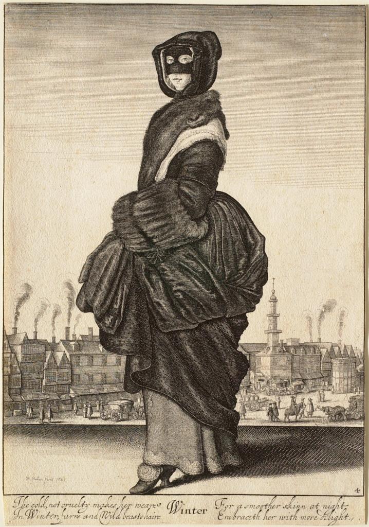 Of course, the biting cold necessitated bundling up in voluminous layers of fur and fabric. The line between function and fashion is blurred where a lady is befurred, hooded, and double-skirted yet she reveals a dainty shoe hardly fit for snow in Winter, an allegorical representation from a series on the seasons by Wenceslaus Hollar. Hollar was a prolific Bohemian etcher who lived in London and Antwerp and had an eye for fashion, among other subjects. His Winter is resplendent in a fur muff, sumptuous skirts, and a mask to shield her skin from daylight. Her attire is approximated by the garments of the many ladies who share the ice in winterscape paintings. While fashion is the outward subject in Hollar’s personification, an inscription reveals a deeper meaning: “The cold, not cruelty makes her weare / In Winter, furrs and Wild beasts haire / For a smoother skinn at night / Embraceth her with more delight.” “Winter” may be warmly dressed but she enjoys the heat of an embrace most of all.