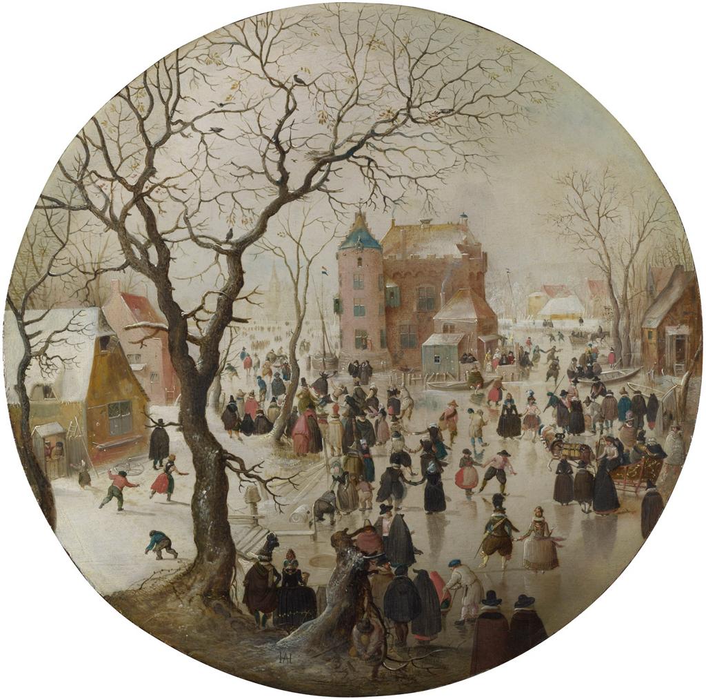 The attributes of the ice scene, fashion, and satire all come together in Skating Owls (1620-1660), an engraving by Adriaen Matham after a painting by Adriaen van de Venne. A painter of many genres (including landscape as shown above), printmaker, and poet, Van de Venne excelled at satire. His quirky owls illustrate the saying at top “How well we go together,” as in birds of a feather. The female owl is dressed in fine fashion, including a millstone ruff and a hoyke (a type of hood ubiquitous in Netherlandish winterscapes), the male in peasants’ clothes. They teeter along invoking the many Dutch proverbs that liken ice to danger and skating to folly, “slipping and slithering … through life,” (as inscribed on prints after Pieter Bruegel’s Skating before the St. George’s Gate). Even the most idyllic winterscapes like Avercamp’s expansive view of 1608 (below), harbor a double meaning. Amid the merriment, the chaos so artfully revealed in splayed skaters, stranded boats and slippery accidents admonishes: no skating on thin ice!