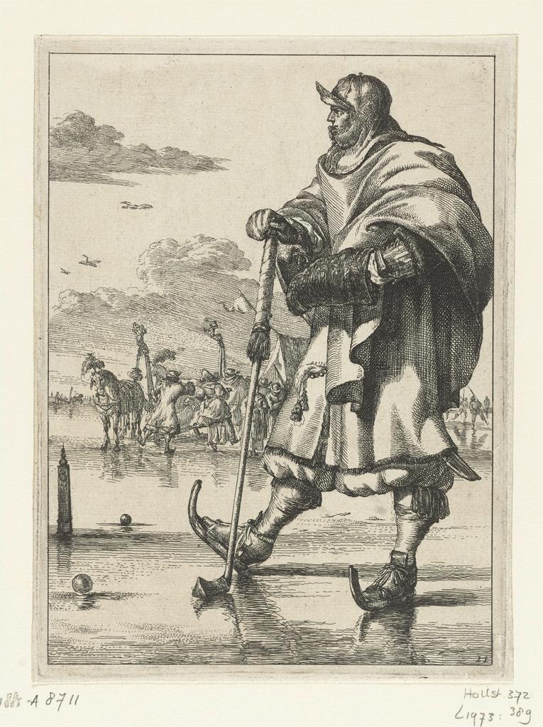 The gallant Kolf player on the ice, from a print series entitled “Figures à la mode” (1670-1685) by Romeyn de Hooghe (baptized 1645-1708) ostensibly presents an athlete (kolf was the Dutch hybrid of golf and hockey). Nonetheless, its sartorial splendor clearly eclipses the sport.