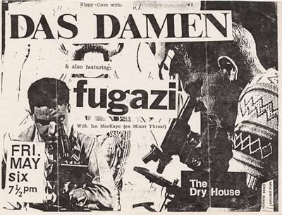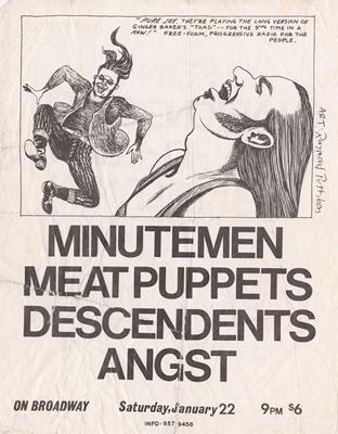 Punk flyers from the 1970s to the 1990s shared many of the qualities of the music they promoted–a DIY aesthetic, an embrace of cheap and accessible technology (i.e., photocopiers), plus a healthy dose of humor. In contrast to the often ornate Art Nouveau-inspired rock posters of the psychedelic 1960s, punk flyers typically featured dissonant collages, crude handwriting, and amateurish drawing–not to mention a strict limitation of color.