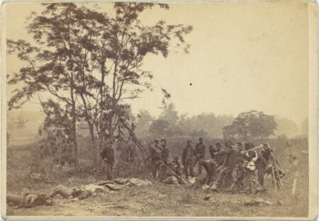 The same conflict provoked the first use of the camera on the battlefield in America when Alexander Gardner photographed the dead at Antietam, mere days after the fighting had ceased. In his Burying the dead, the subtle reference to mortality from Rimmer’s painting is laid bare and made immediate by the new medium of photography.