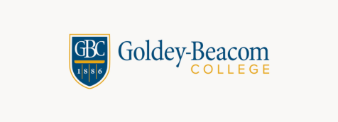 Exterior of a brick academic building with a “Goldey-Beacom College” sign, framed by blooming trees in spring.
